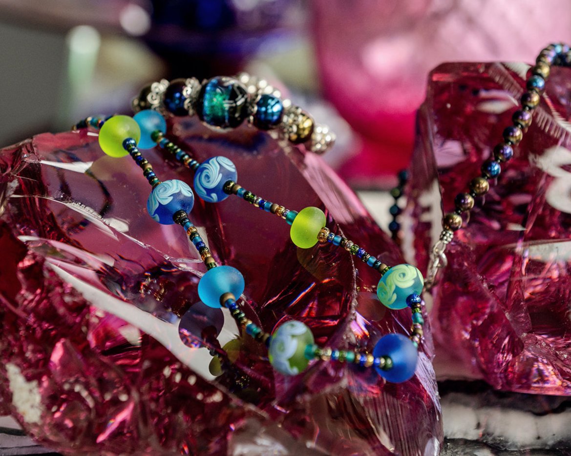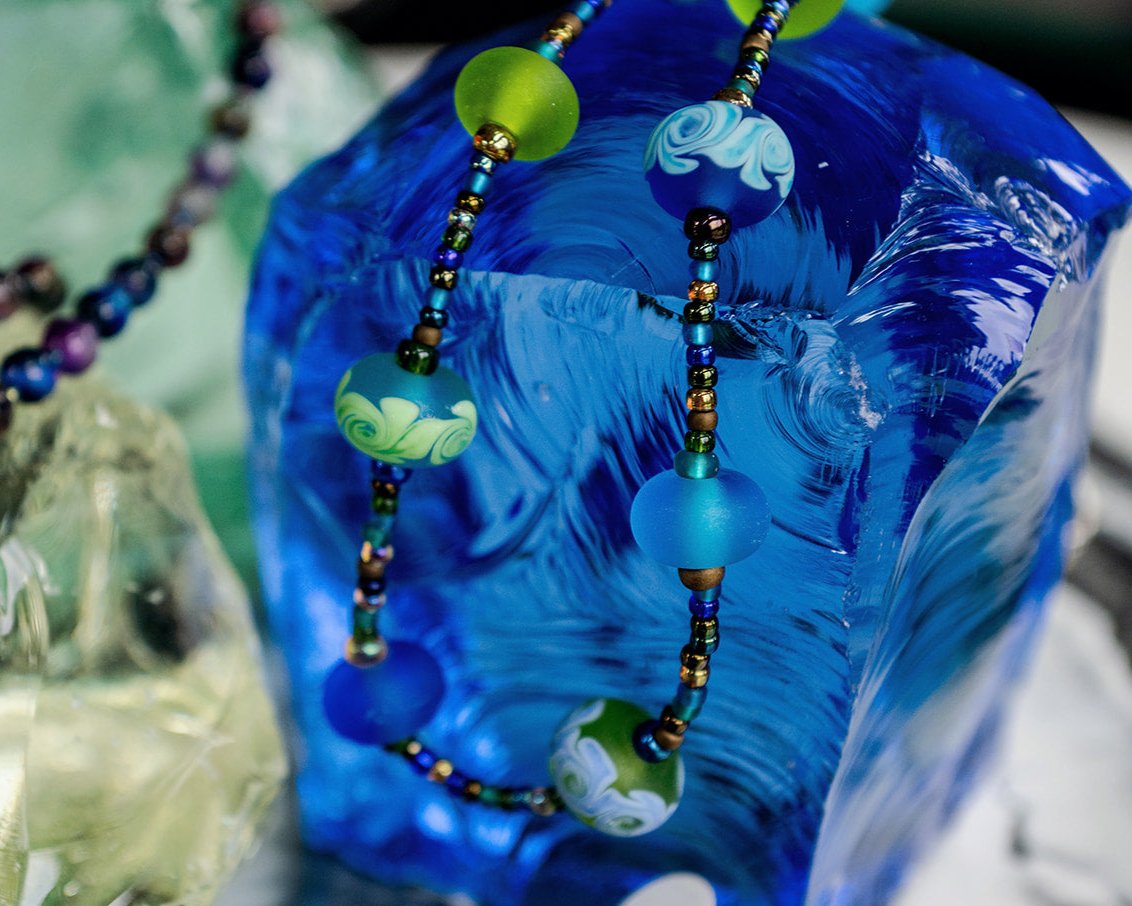 Etched lampwork beads on 21"chain with sterling silver clasp.